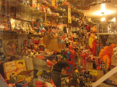 )、紙芝居屋の自転車や昔の冷蔵庫など、が一応テーマごとに陳列されている風…かと思うと、いきなり日本の妖怪が現れたり、壁一面に懐かしい映画のポスターが展示されていたり…月光仮面が現れたり、ミニチュアカーやら、リカちゃん人形やら、懐かしき駄雑貨なども節操なく並べられておりました。
