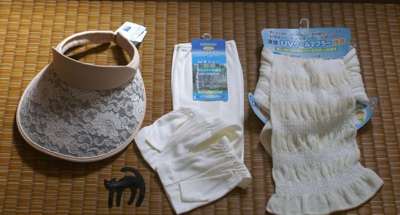 今まで買ったことも、もちろん身につけたこともない、肘の上までカバーする、UV対策手袋(腕袋?)襟元を紫外線から守る、UVクールマフラー、そしてサンバイザーを早速購入した。勢いにのって日傘も買おうかと思ったが、殆ど自転車で行動しているわたしには、宝の持ち腐れになりそうだから、と冷静な判断をして、今日のところは止めておいた。
