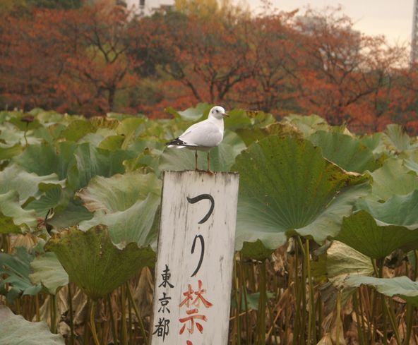↓不忍池の看板に止まる